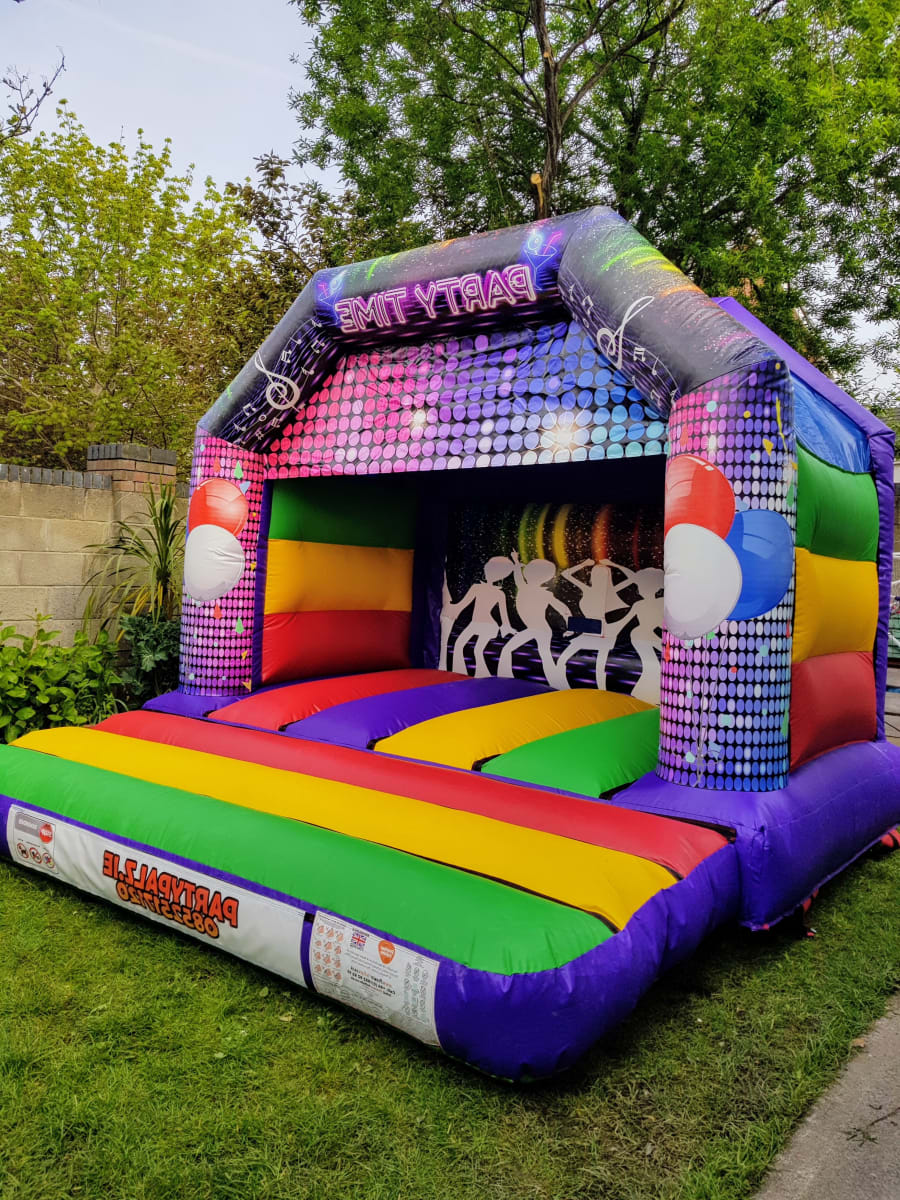 Our Disco Themed Bouncy Castle is a popular design and a perfect fit for small back garden hires and comes with a built in raincover. It can be hired with or without the LED Disco Light and Bluetooth Speaker, although both are included in the price!