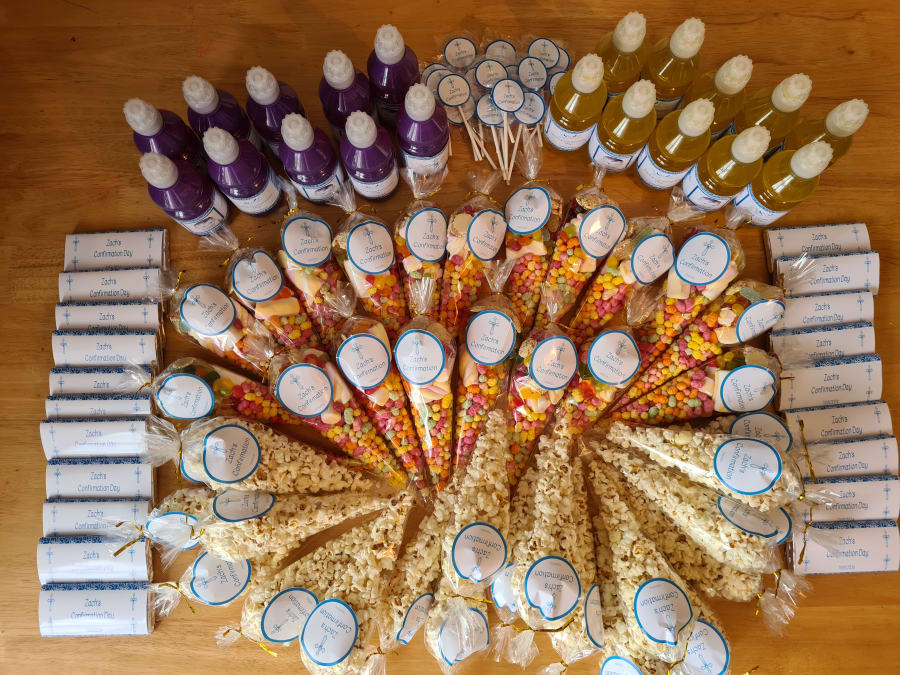 This Personalised Sweet Bundle includes x 20 Sweet Cones, Popcorn Cones, Chocolate Bars, Mixed Drinks and Lollipops.
